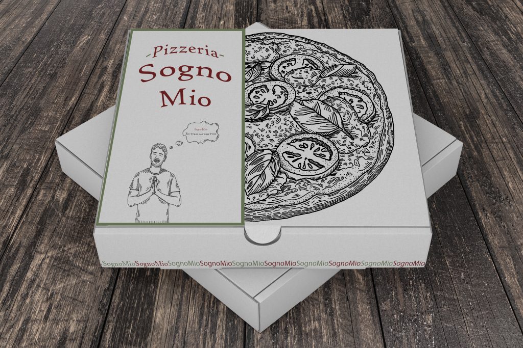 Meinen Pizzakarton habe ich für die Pizzeria Sogno Mio gestaltet. Ich wollte das Design minimalistisch halten, da Pizzakartons nur für eine kurze Zeit zum transport der Pizza benutzt werden und danach schnell im Müll landen. Die Farben orientieren sich an der Pizza Margharita, die auch als Illustration auf dem Karton abgebildet ist. Sowie die Illustration einer Person und der Satz „Mein Traum einer Pizza“, da Sogno Mio übersetzt Mein Traum bedeutet.