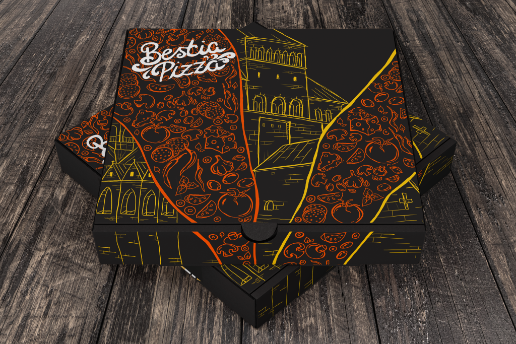 Um einen persönlichen Bezug zu unserem wunderschönen Hildesheim zu schaffen, habe ich Details des Hildesheimer Dom mit in die Gestaltung integriert, zusammen mit Zutaten die jeder mit Pizza verbindet. Die Hintergrundfarbe ist schwarz, schlicht und zeitlos und bringt das rot und gelb zum leuchten.