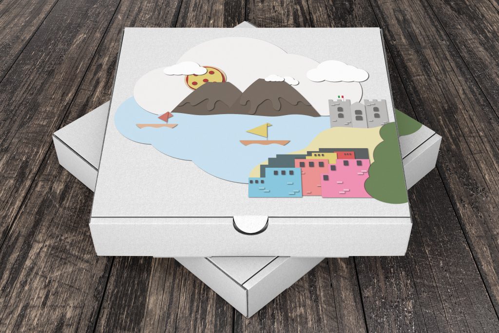 Auf dem vierten Pizzakarton wollte ich die wichtigsten Sehenswürdigkeiten Neapels darstellen, da Neapel der Herkunftsort der Pizza ist. Das Motiv soll an eine Collage aus Papier erinnern.