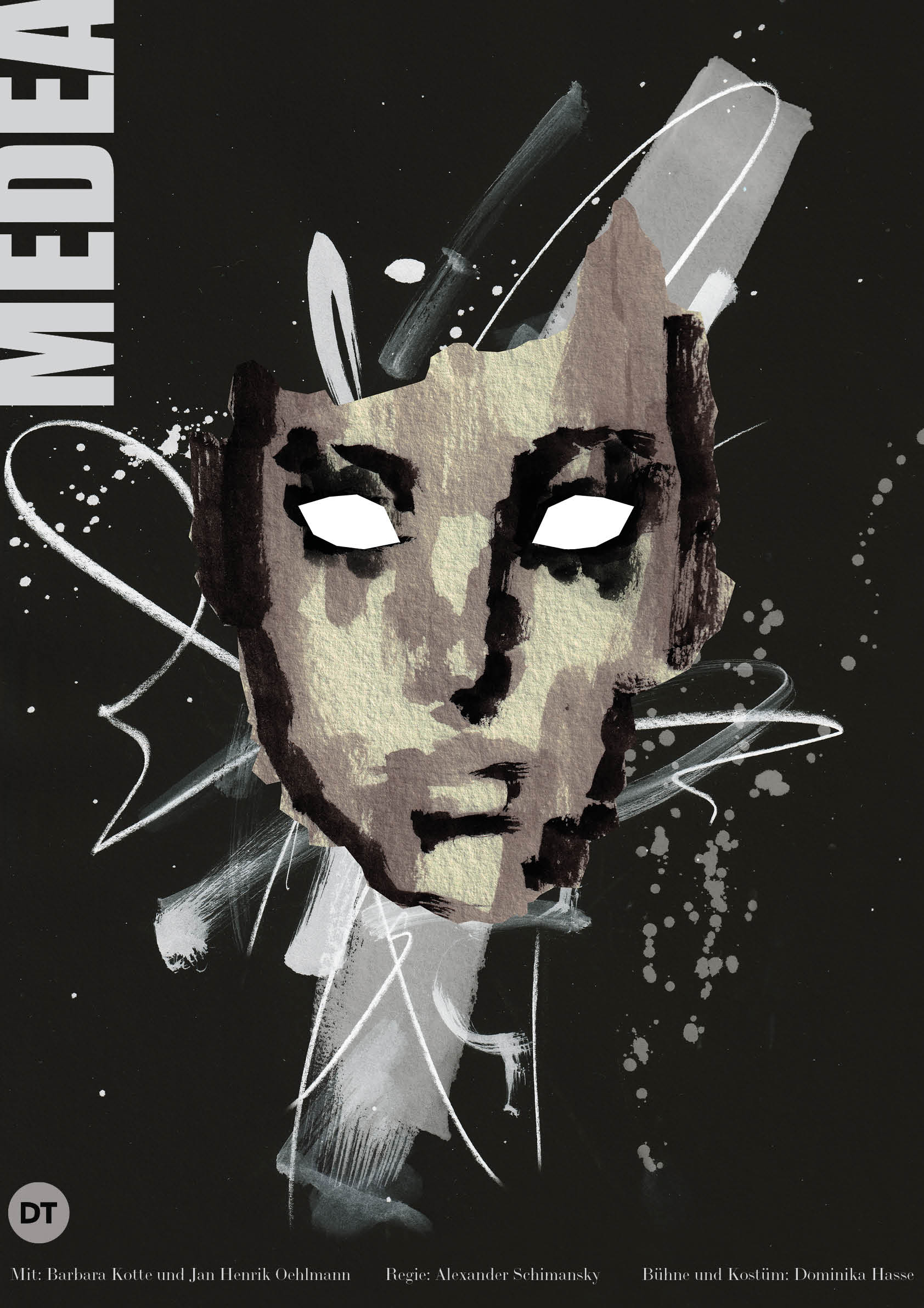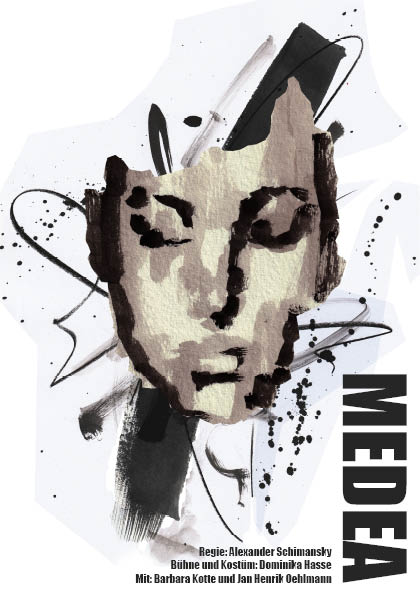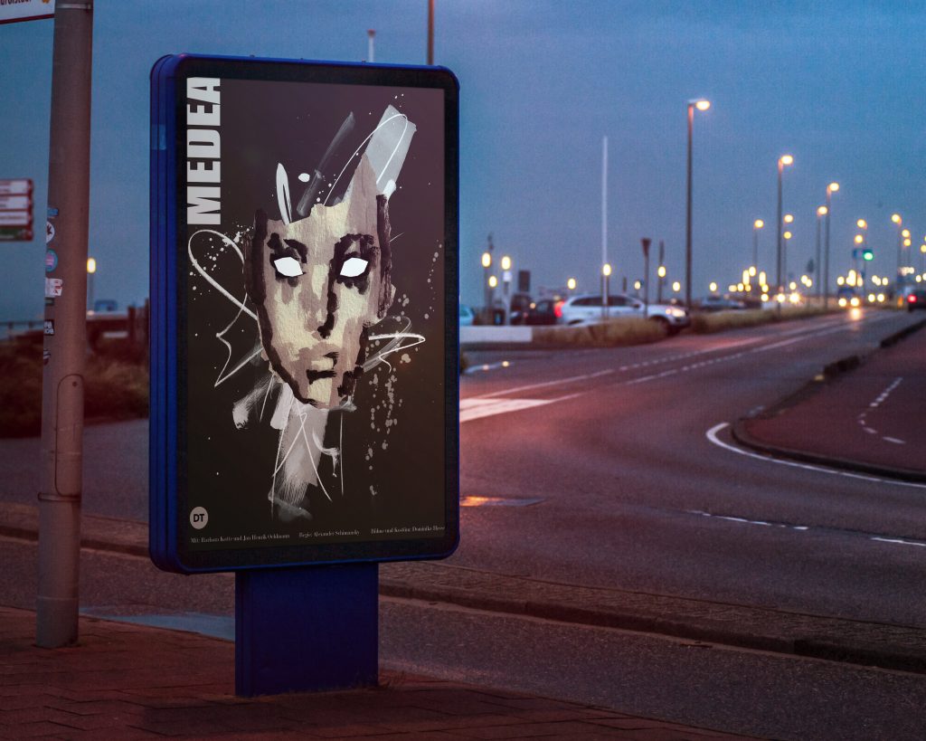 Beim Plakat wollte ich im Gegensatz zum Libretto die Aufmerksamkeit eines vorbeigehenden Betrachters aufs Plakat ziehen. Deswegen sind Medeas Augen geöffnet und schauen den Betrachter direkt an. Damit ihr Blick noch intensiver wirkt, sind ihre Augen das hellste Element des Plakates und liegen sehr mittig.