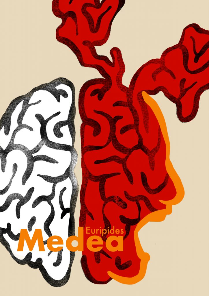 Die Illustration zeigt ein Gehirn, dessen rechte Seite (zuständig für Emotionen) zum einen auseinanderquillt/ aufplatzt und zum anderen die Silhouette einer schreienden Person bildet. Dies soll im übertragenen Sinne darstellen, wie Medea ihren „Verstand verliert“ und ihre Emotionen überkochen; es erinnert auch an „wütende Dampfwolken“, wie sie in Comics oft verwendet werden. Die linke Seite habe ich ganz gelassen und blau eingefärbt, da sie die rationale Seite ist und für die strategische, kaltblütige Art von Medea stehen soll.