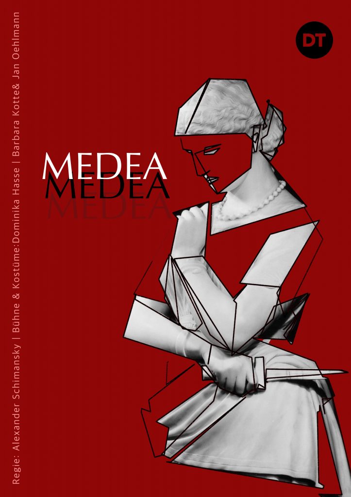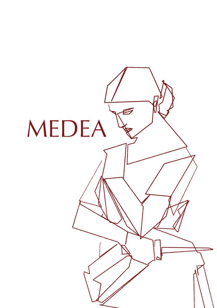 Mit dem Schriftzug MEDEA sind die Schattenseiten von Medea dargestellt, ein reines Weiß zu dunklem Schwarz bis hin zu Blutrot.