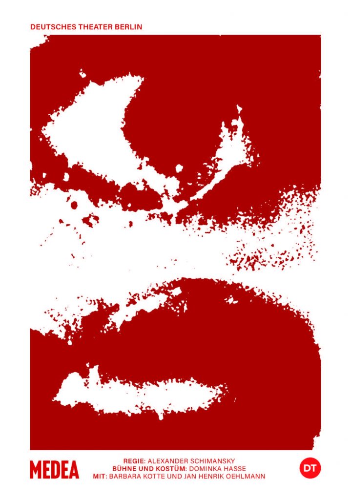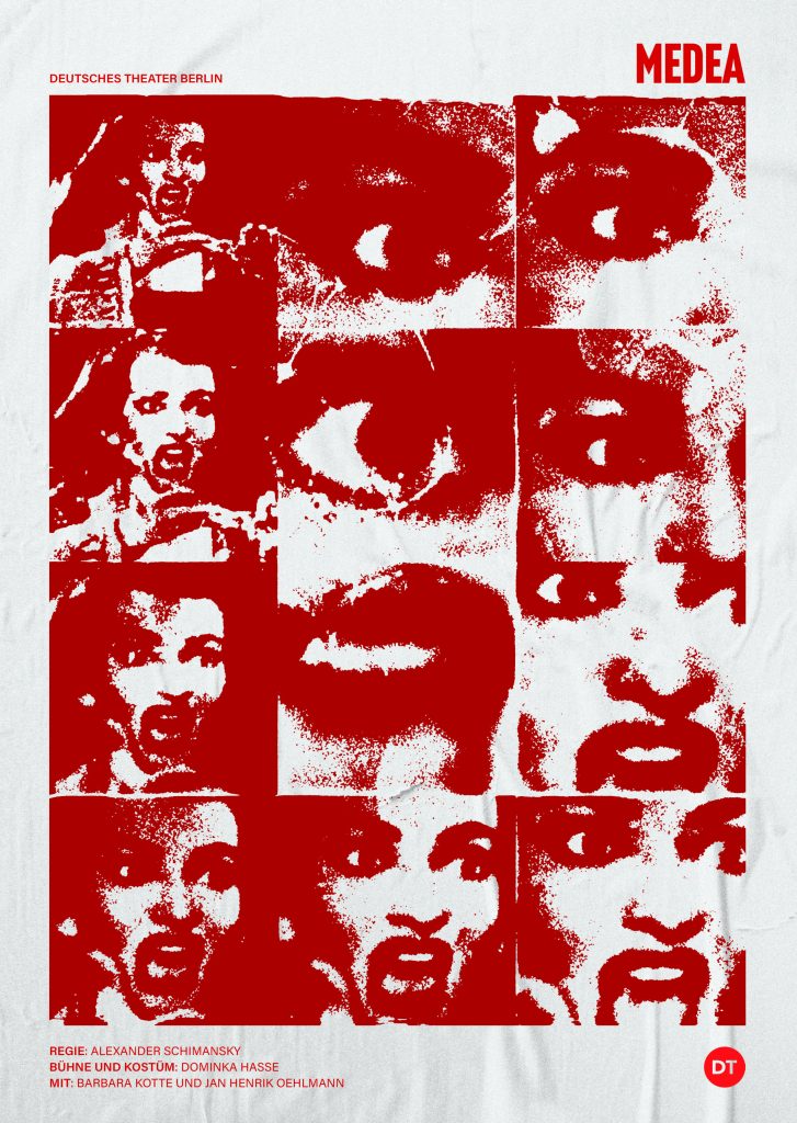 Für mein Medea Plakat habe ich mich von dem fotografischen Beispiel in der Präsentation inspirieren lassen, und ein Cover gestaltet, das in verschiedenen Frames das Gesicht einer Frau (Maria Callas) vergrößert. Auf dem Foto hat sie einen sehr expressiven Gesichtsausdruck, der die Intensität des Charakters darstellen soll. Ich habe mich dafür entschieden, es monochrom in rot zu halten, da mir die Optik gefällt und es die Dramatik unterstreichen soll. Zusätzlich sind die Bilder stark reduziert und mit einem Rauschfilter bearbeitet. Die Anordnung der Bilder ist schneckenartig, sodass der Blick beim Verfolgen der Vergrößerung in der Mitte des Plakats endet. Die Schrift ist simpel und klar gehalten, um die Lesbarkeit auf weite Entfernung zu erhöhen, die durch die Größe der Schrift wichtig ist. Für das Libretto habe ich einen kleinen Ausschnitt des Plakats gewählt und die Schrift ähnlich angeordnet, damit es zusammen passt.