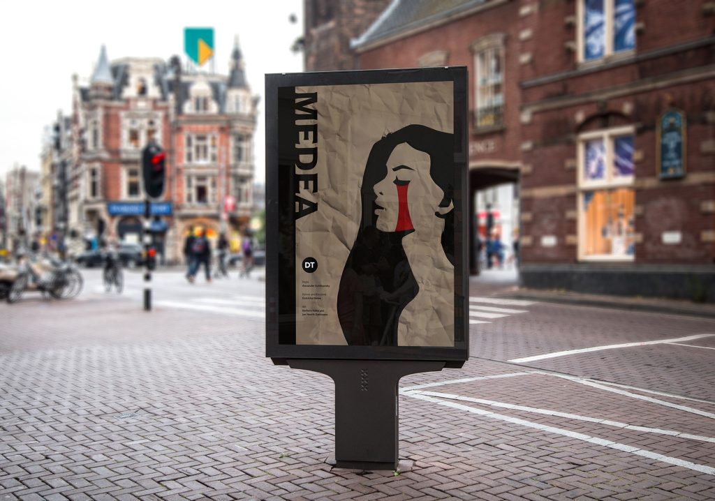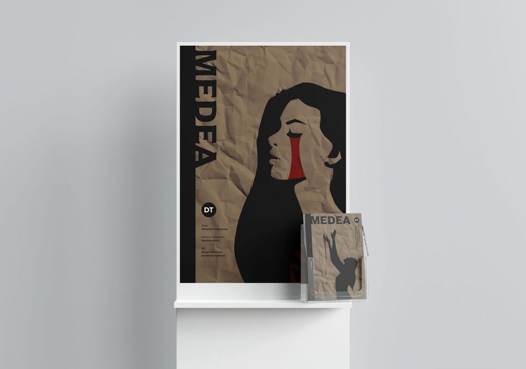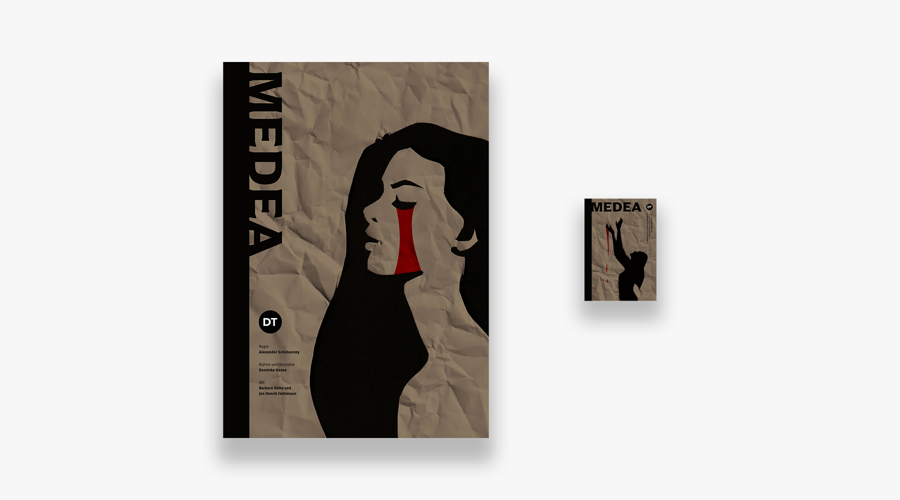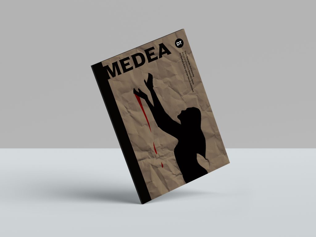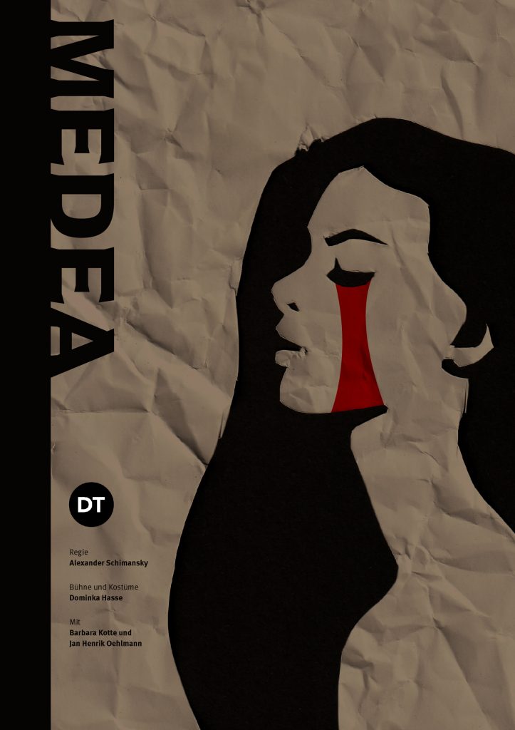 Das zerknüllte Papier, aus dem ich die Formen geschnitten habe steht für die geplatzten Träume Medeas. Die blutroten Tränen, welche an ihrem Gesicht herunterfließen verkörpern ihre Trauer und Wut zugleich. Insgesamt herrscht eine düstere und verzweifelte Stimmung.