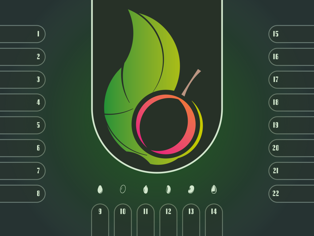 Die Fächer, Unten und an den Seiten können herausgezogen werden. In jedem Fach befindet sich ein Samen mit einer kleinen Beschreibung.