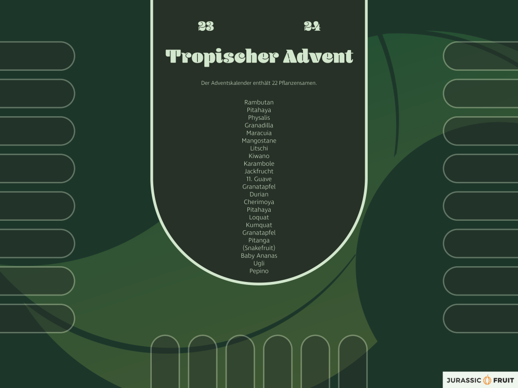 Das Unternehmen „Jurassic Fruit“ verkauft tropische Früchte und exotisches Gemüse. Die Lebensmittel gelangen vom Baum direkt in den Versand zum Kunden und sind somit so frisch wie möglich. Um „Jurassic Fruit“ zu unterstützen habe ich einen Adventskalender erteilt in dem 22 Obstsamen zu finde sind. Der Kalender, beinhaltet außerdem ein Buch über Tropenfrüchte und ihren Anbau.