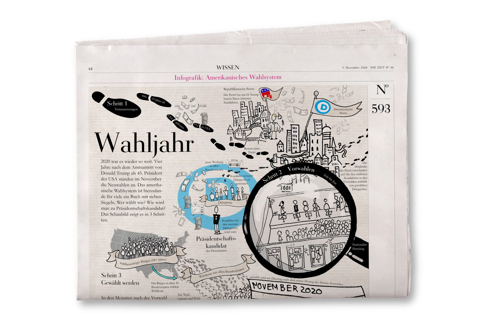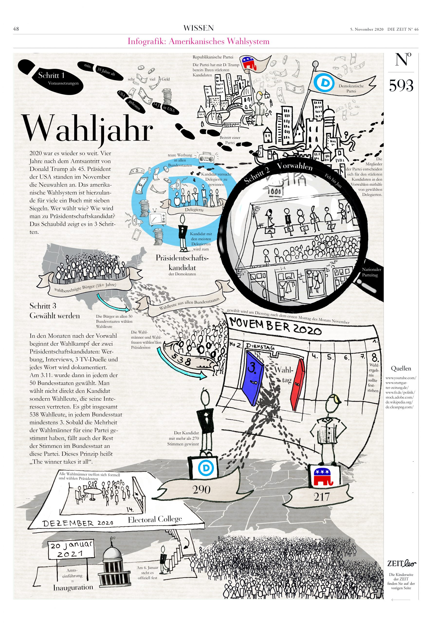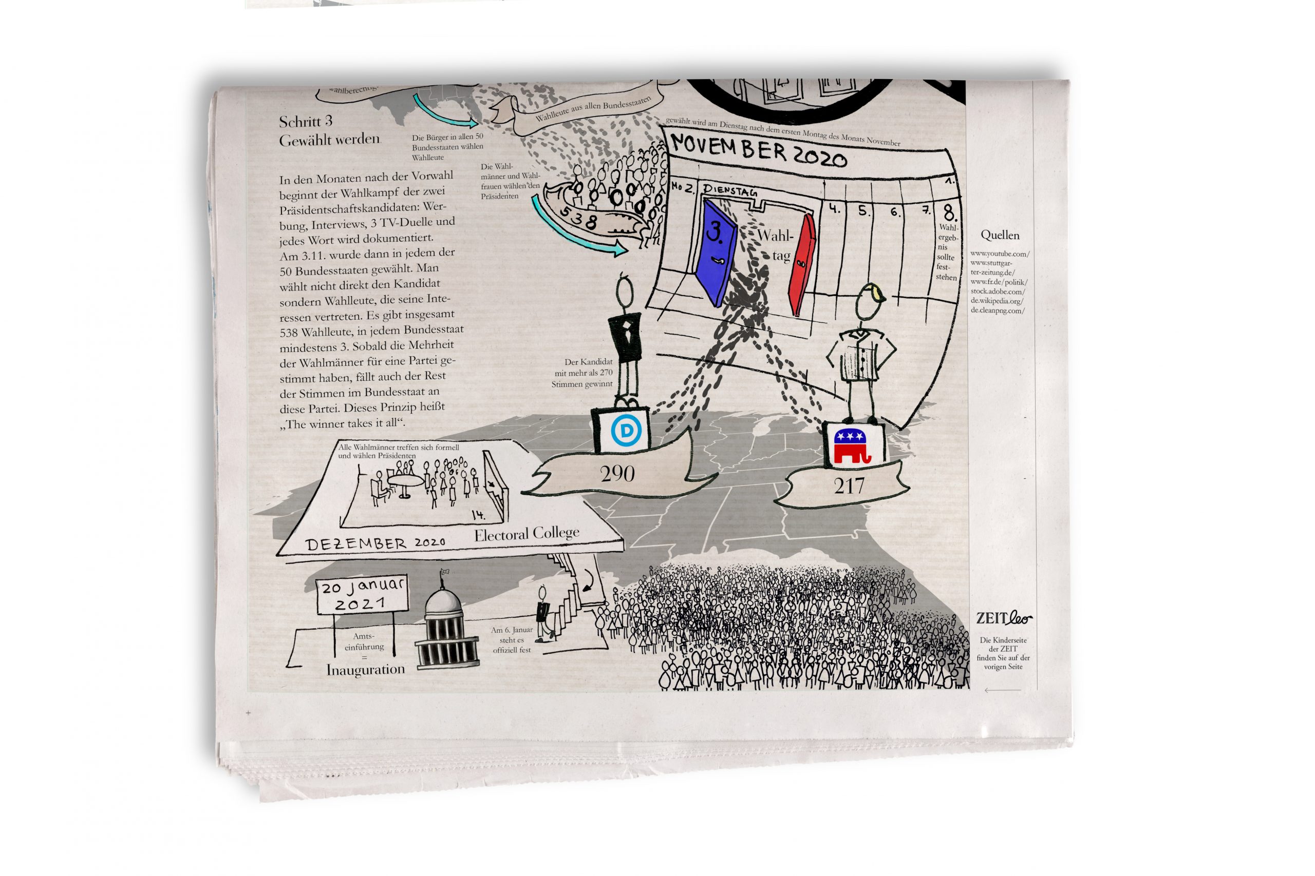 Wie in dem Einführungstext zu lesen, ist das Wahlsystem der USA in Deutschland für viele ein Buch mit sieben Siegeln. Da es so komplex ist, bietet es sich an die Erklärung durch eine Infografik zu unterstützen.