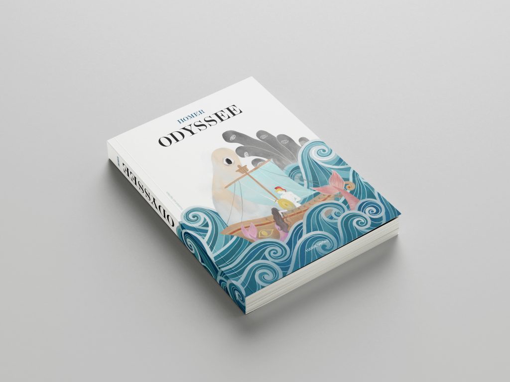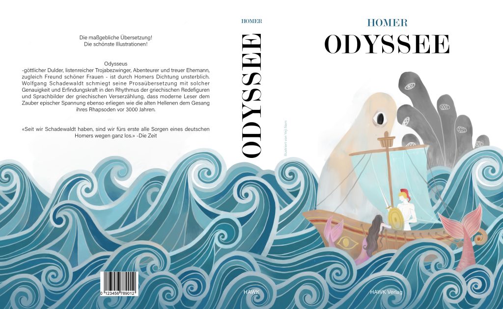 Die meistene Buchcovers für Odyssee sind nicht farbig oder änhliche Bilder verwendet. Deswegen habe ich bei der Gestalltung versucht eine farbige Illust zu malen und die Benutzung einer dekorative Schrifft zu vermeiden.