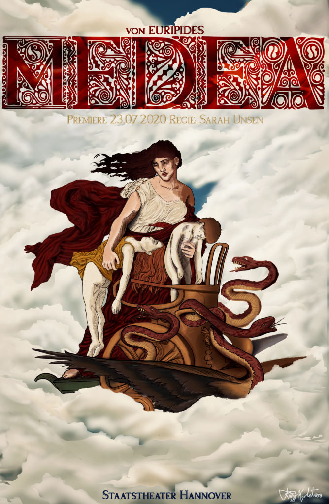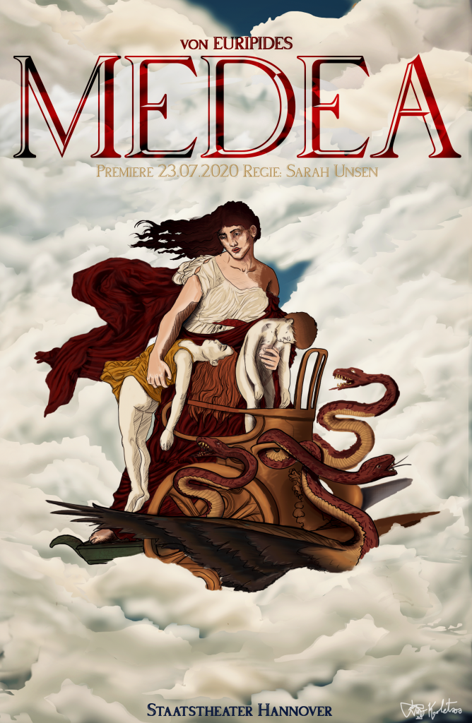 Wir sehen einen Streitwagen geführt von deionem Drachen mit drei Köpfe und Medea die ihre zwei