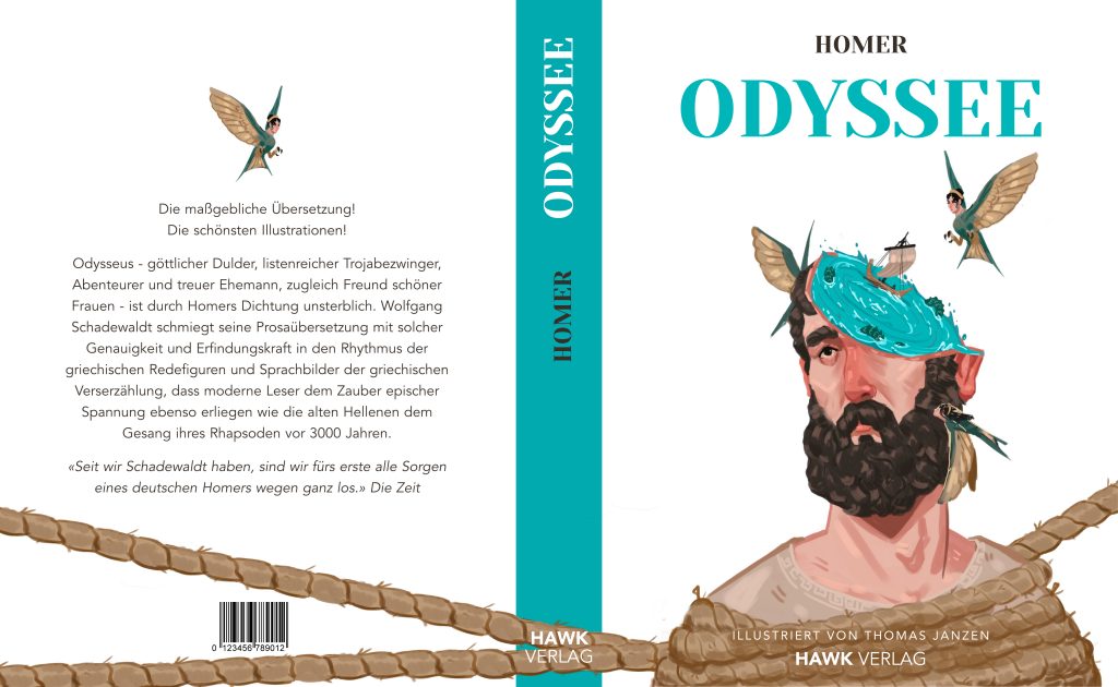 Für den Buchumschlag illustrierte ich Odysseus, welcher mit Tauen gefesselt ist. Der Buchumschlag zeigt nur Elemente der Erzählung in einer surrealen Illustration zusammengemischt und keine klare Szene um den Betrachter nicht zu viel von der Geschichte zu verraten, aber trotzdem passend zum Inhalt zu sein. Angedeutet sind die Seeungeheuer am Strudel im Kopf, die Sirenen um Odysseus mit den Tauen, die ihn fesseln und die Zyklopen, durch das nur eine sichtbare Auge.