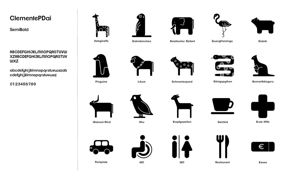 In zoologischem Garten kann man wegen Tiere und Natur schon viele verschidene natürliche Farben sehen. Deswegen habe ich zur gute Erkennung das Schwarz als die Konzeptfarbe ausgewählt. Die Schrift habe ich auch wie die Piktogramme rund aber simpel und modern gehalten.
