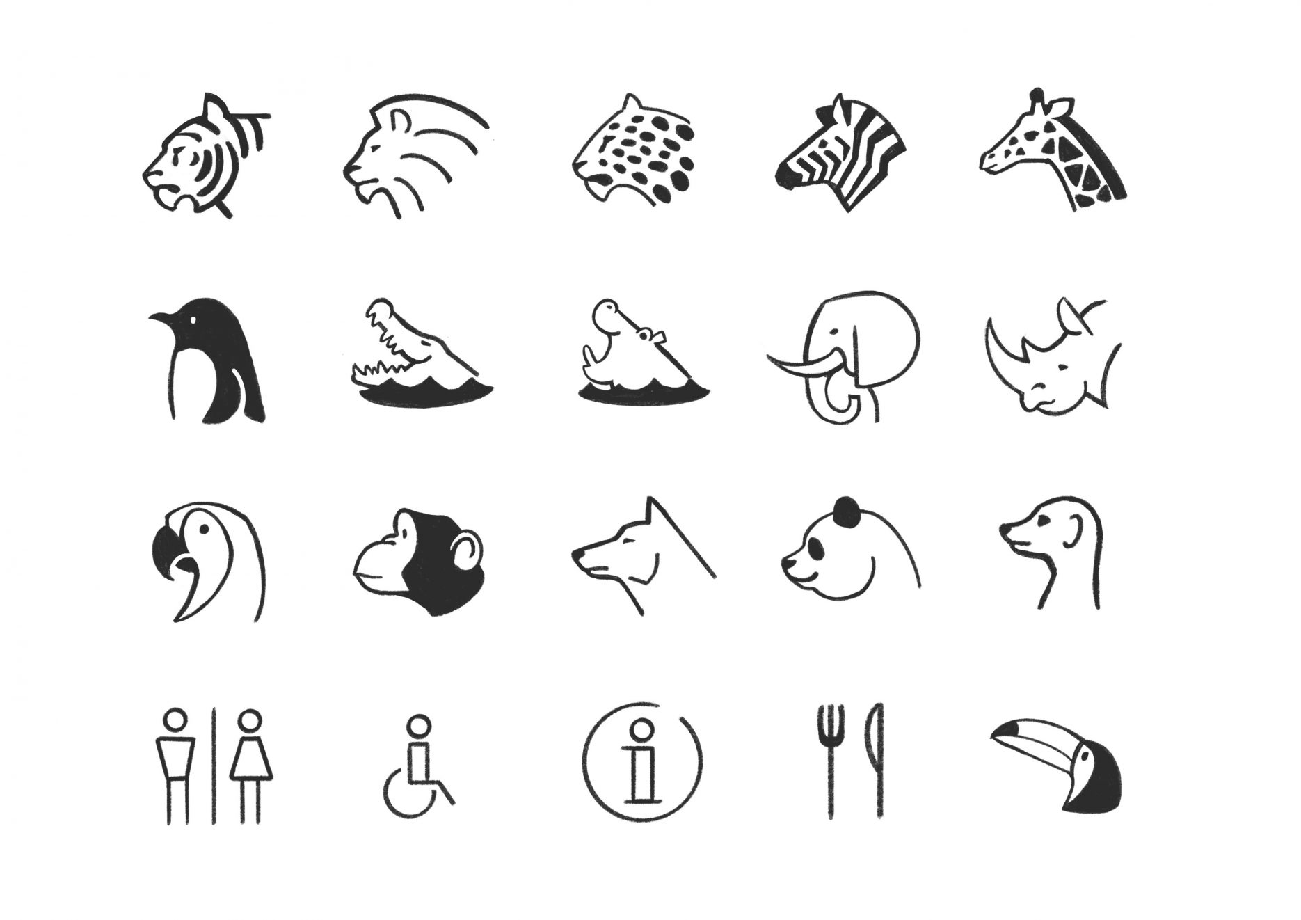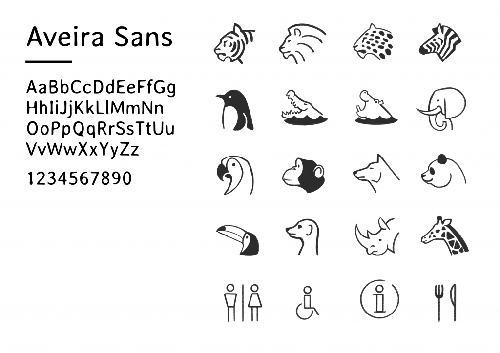 Die Piktogramme zeigen verschiedene Tiere des Tierparks die bei der Orientierung der Besucher im Park helfen sollen. Deswegen zeigt der Großteil der Piktogramme das Profil eines Tieres und der Rest Piktogramme für WC’s, Infostände und Essensmöglichkeiten. Der Stil ist illustrativ um passend zum Tierpark etwas natürliches zu vermitteln. Damit die Tiere schnell erkannt und auch gut unterschieden werden können, illustrierte ich sie von ihrem Profil, wo man die meisten Merkmale der Tiere erkennen kann. Passend zum Illustrationstil wählte ich die Schrift Aveira Sans.