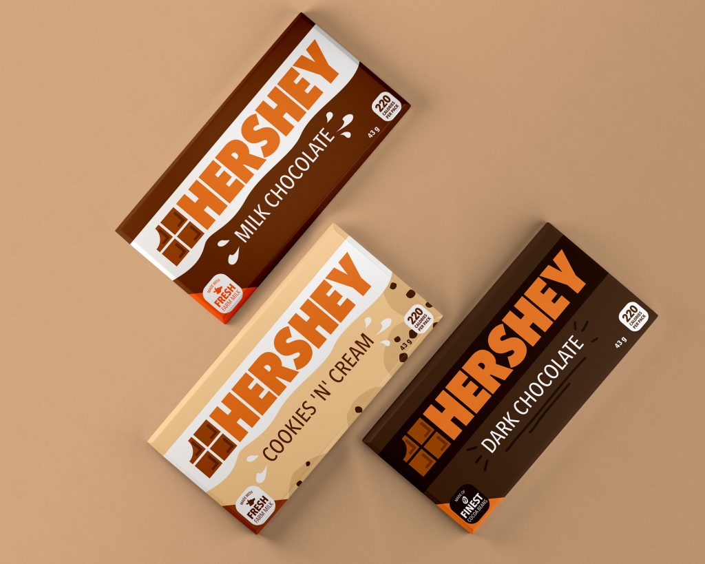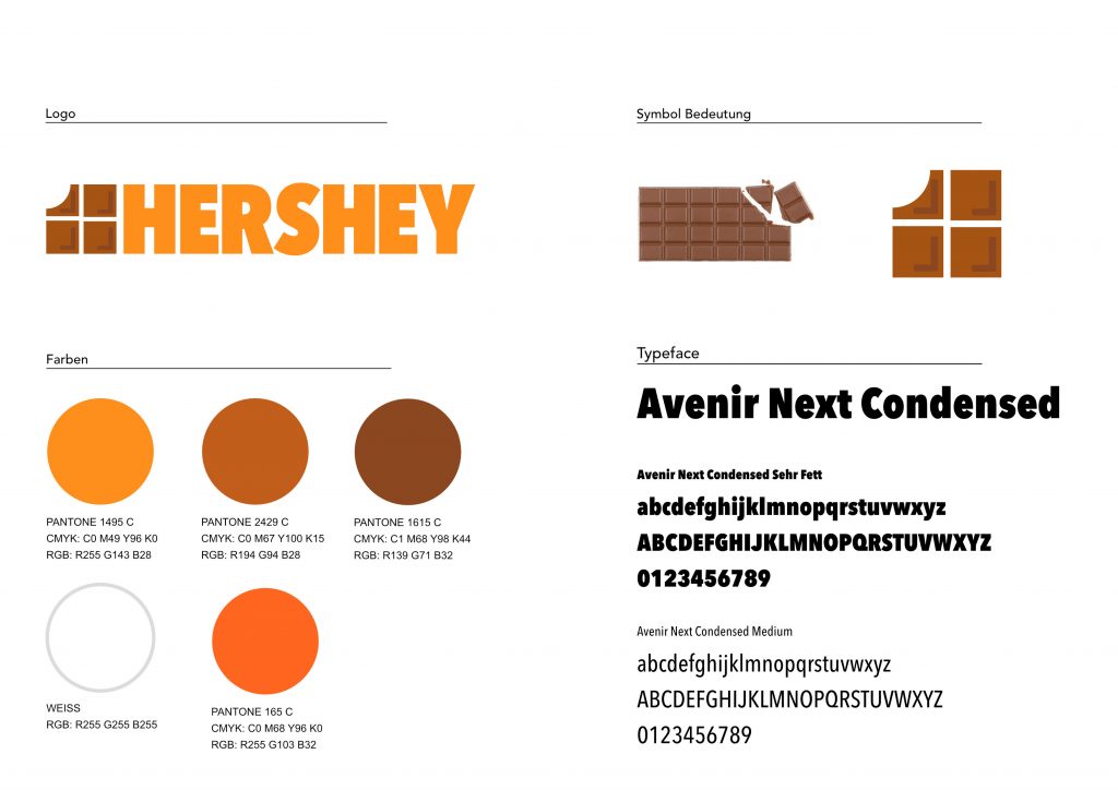 Für die Bildmarke entschied ich mich für ein Stück einer Tafel Schokolade anstelle des Schokoladenkusses des alten Logos um eine bei vor allem jüngeren Kunden bekanntere Schokoladenform zu zeigen. Die neuen Farben sind knalliger und wärmer um den Schokoladenaspekt mit reinzubringen. Um trotzdem etwas von dem alten Design von Hershey auf zunehmen, ist der Schriftzug in Versalien gehalten.