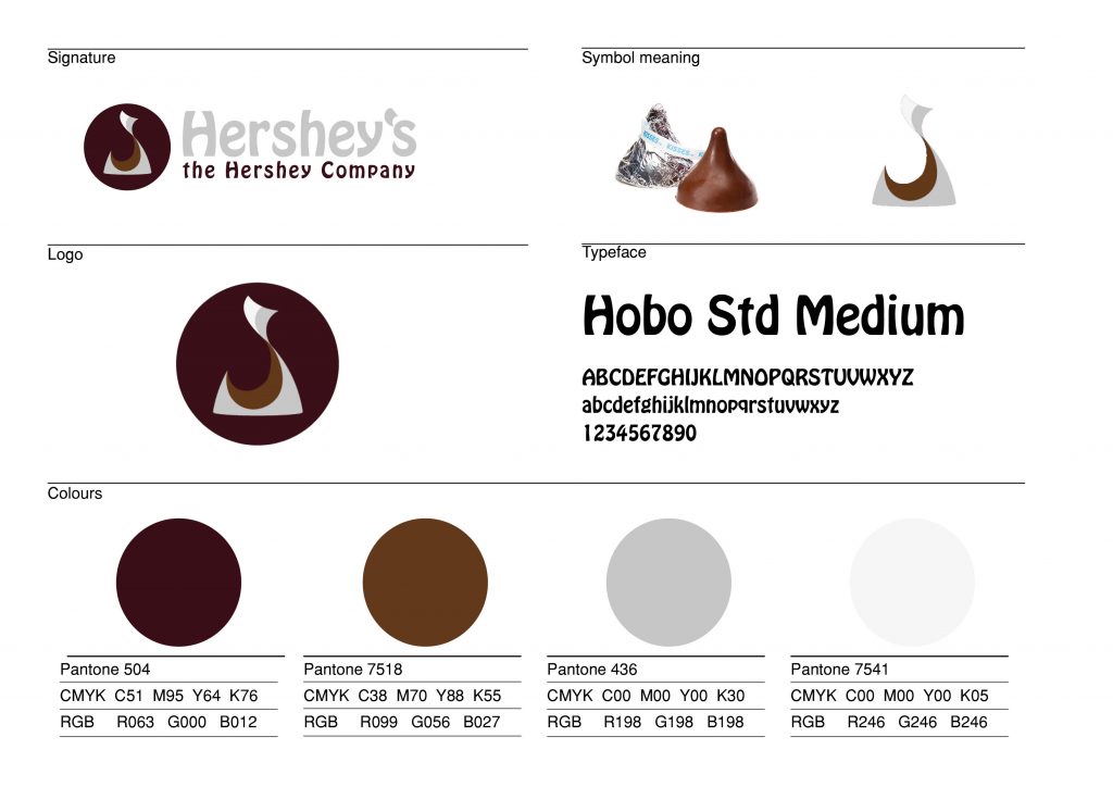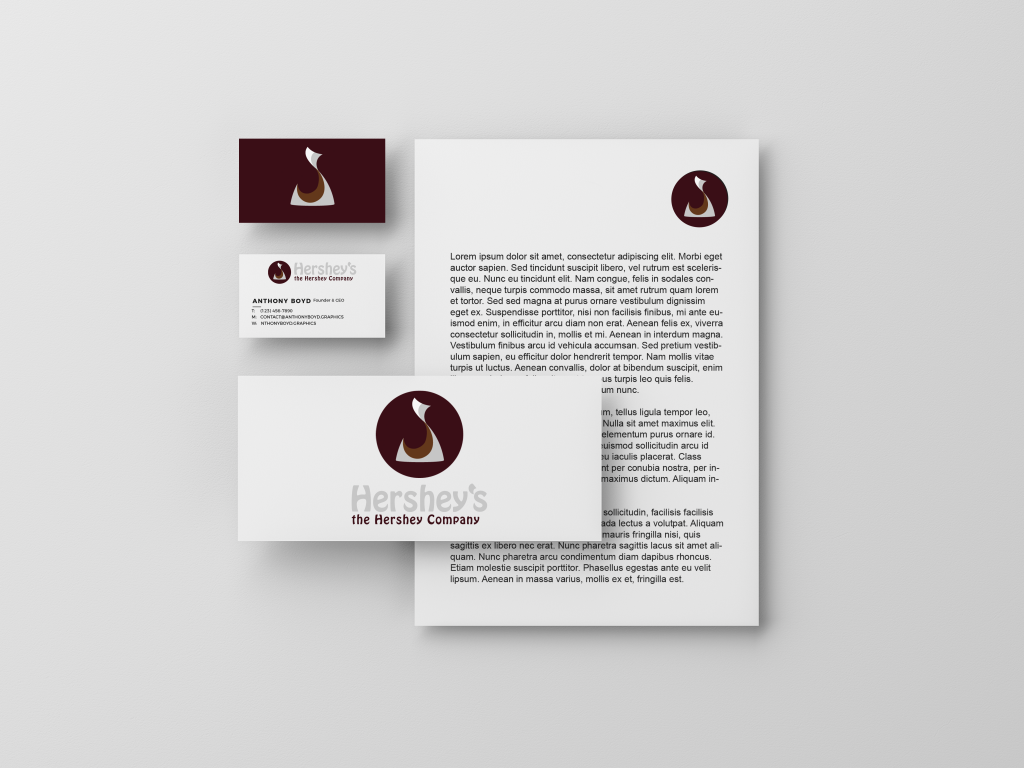 Zunächst schaute ich mir deren jetziges Branding an, welches missglückte. Ich recherchierte zusätzlich und schaute mir auch viele Re-Re-Brandings anderer Designer an. So stellte ich fest, dass die „Kisses“, die Hershey herstellt und verkauft, der zentrale Fokus ist. DIe Öffentlichkeit verbindet diese Küsse mit der Firma. Basierend auf dieser Erkenntis wollte ich einen Hershey-Schokoladenkuss ins Zentrum rücken und darauf das Branding aufbauen.