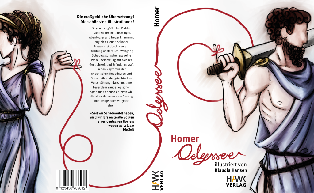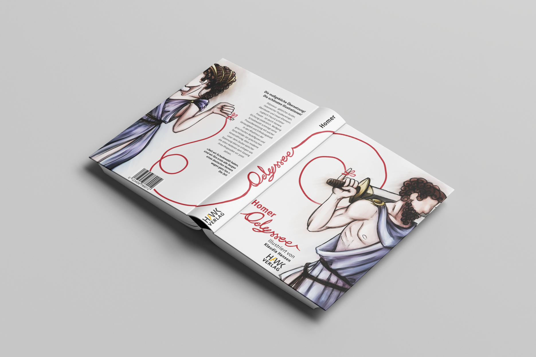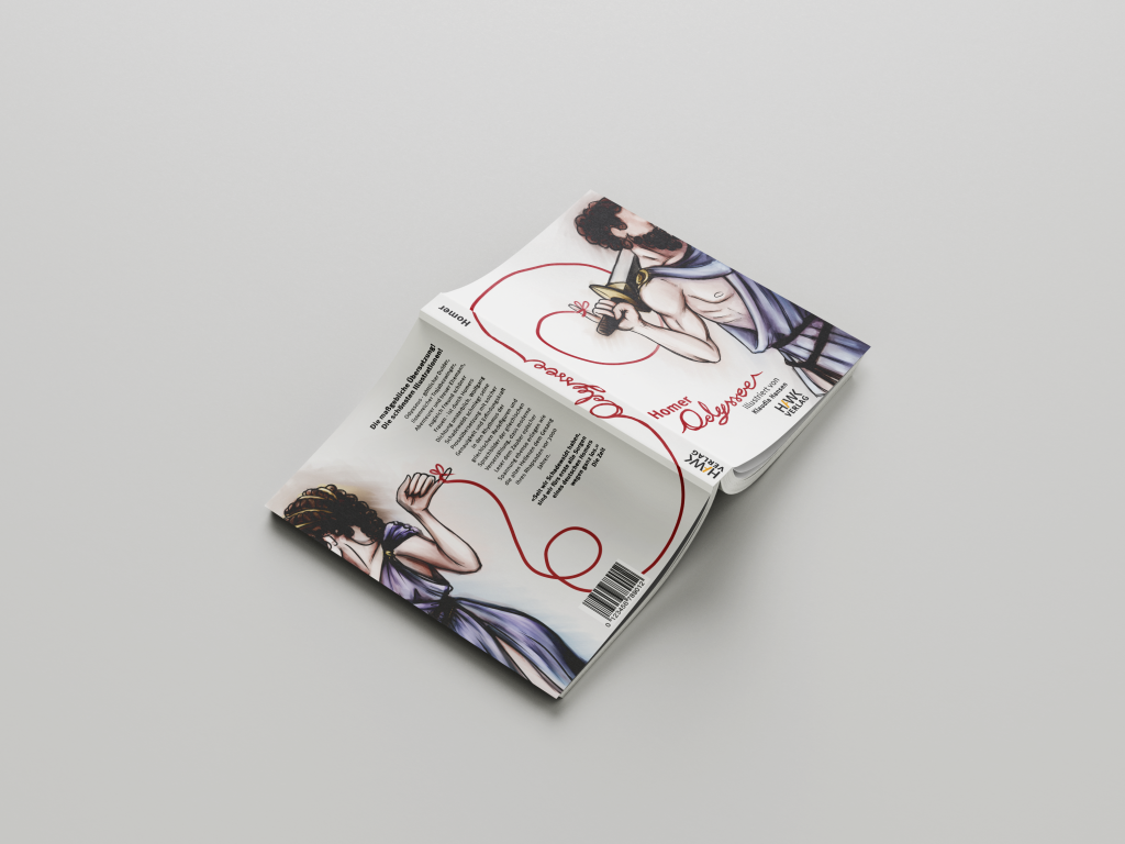 Der rote Faden symbolisiert zugleich die unglaublich lange Reise, auf welche Odysseus geschickt wird bevor her nach Hause zurückkehren kann. Der Titel des Buches ist im Faden enthalten.