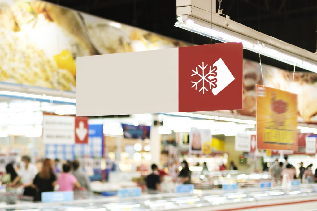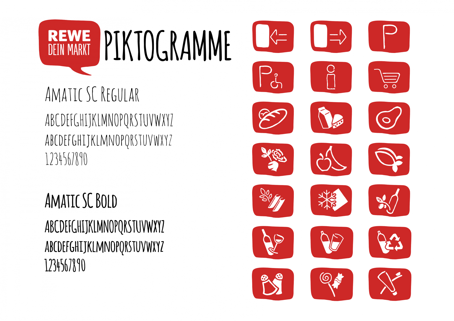 Ich habe nach der verwendeten Typografie der Supermarktkette gesucht, und mich an deren Logo orientiert, da die Piktogramme zum Erscheinungsbild der Kette passen sollen.