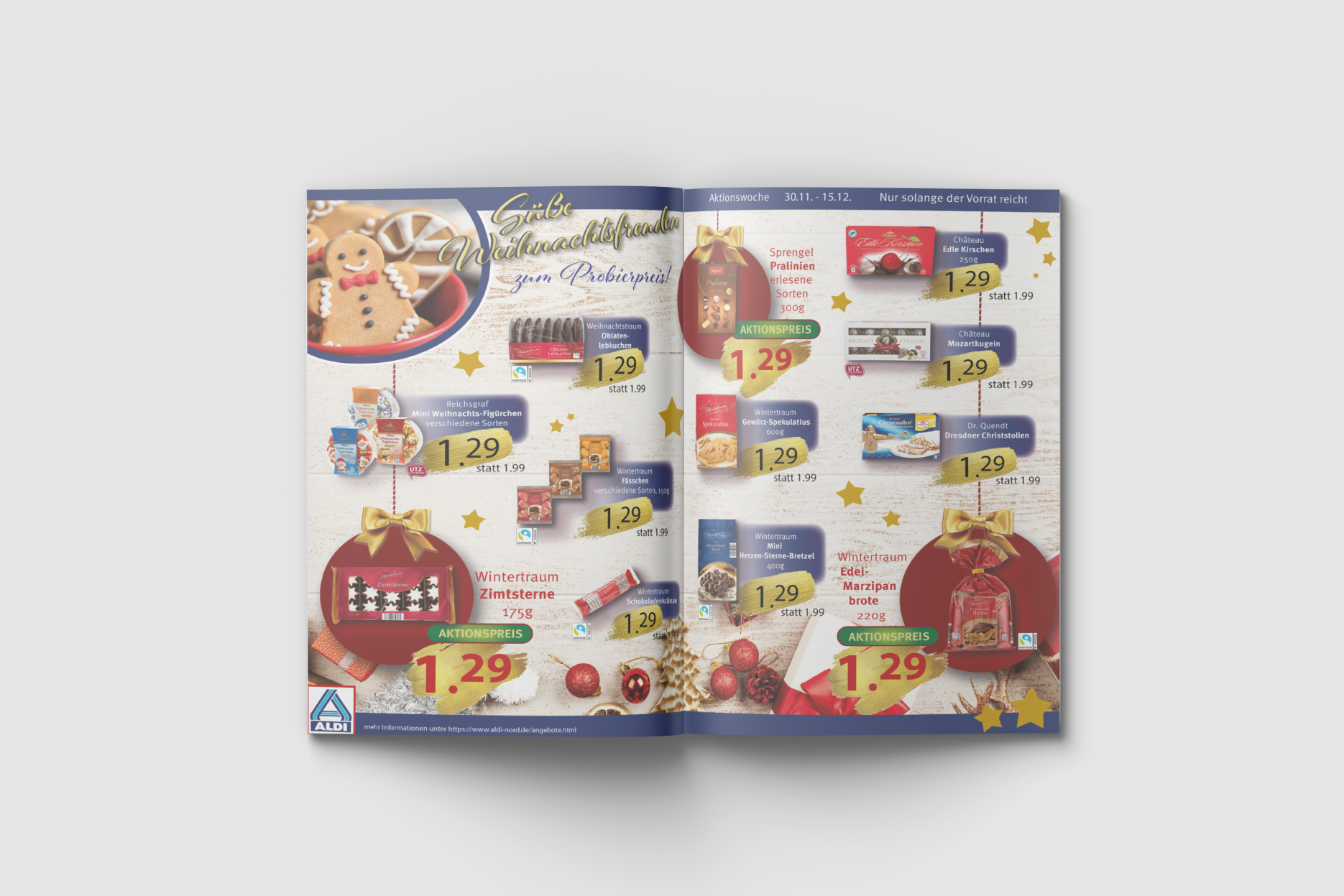 Zunächt erstellte ich Skizzen, wie ich mir den Aufbau eines Supermarktfylers vorstellen könnte. Zusätzlich hierzu habe ich mir bisher veröffentlichte Aldiflyer, insbesondere deren Weihnachtsflyer, angeschaut und mich von diesen inspirieren lassen.